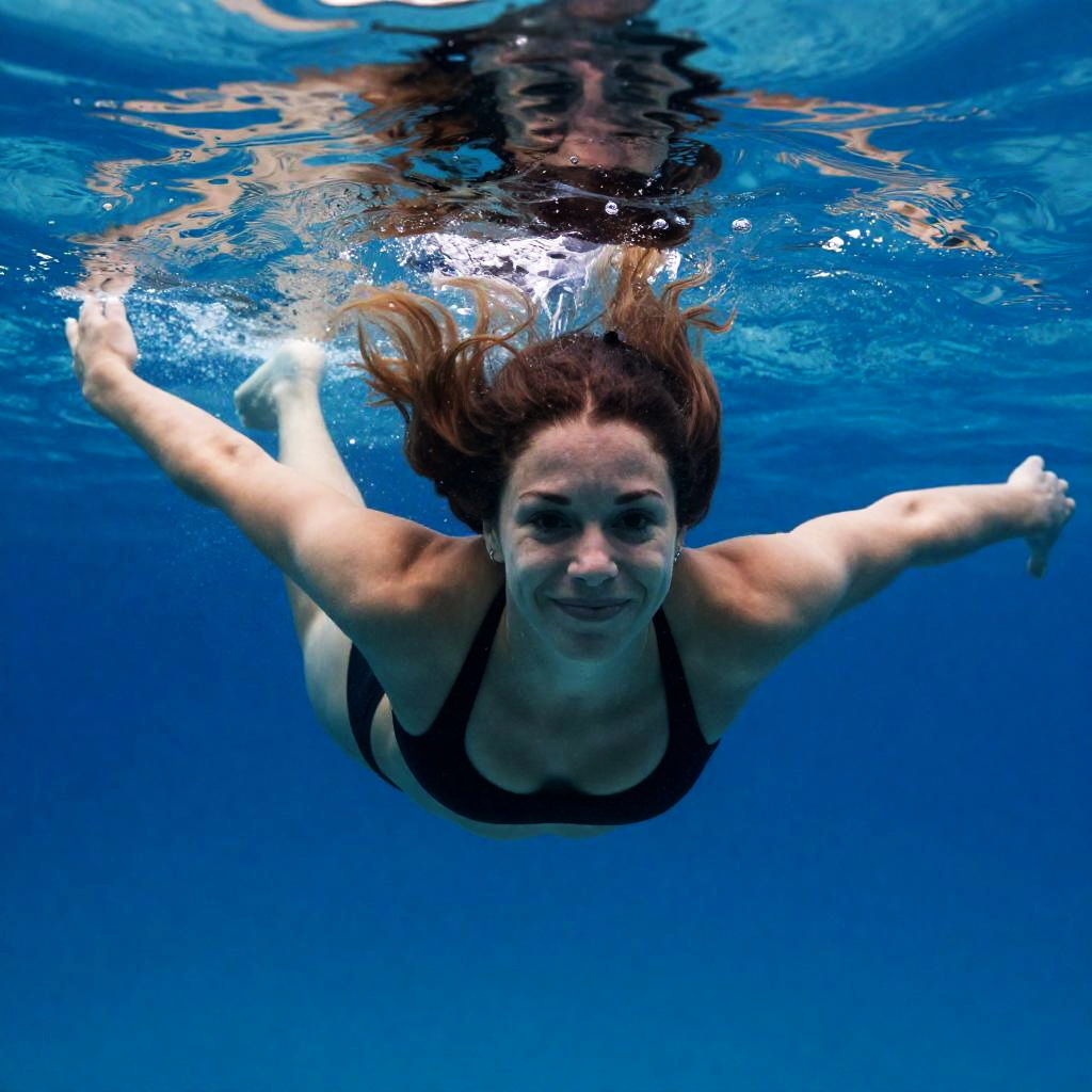 Photograph of a bald, muscular man underwater wearing black snorkeling mask and dark swim trunks. Greenish-blue light filters through. Man's upper body is visible, looking slightly to the side. Background is mostly clear with subtle light gradients.