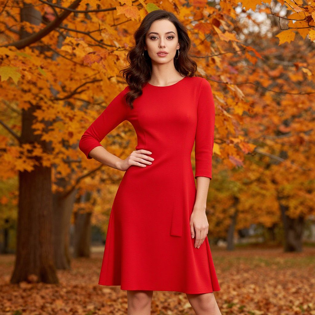 A stylish woman poses elegantly in a vibrant red dress amidst a picturesque autumn setting. Surrounded by trees adorned with warm orange and yellow leaves, she exudes confidence and charm, perfect for fashion-focused content or seasonal events.