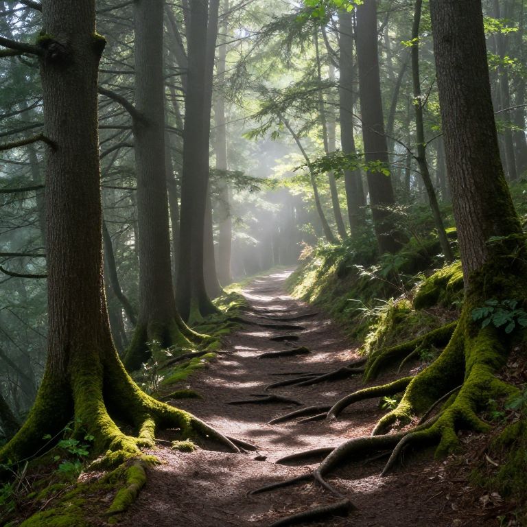 Moss-covered roots intertwine beneath towering trees in a serene, misty forest, casting dappled shadows along a winding dirt path that vanishes into the ethereal light filtering through the canopy above.