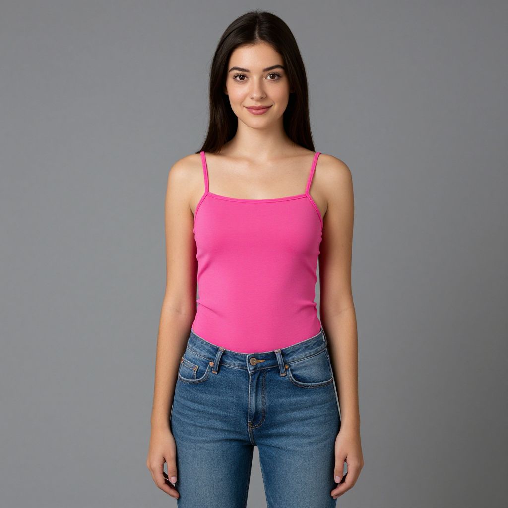 Spaghetti Strap Tank Top Costume, woman in a pink top and blue jeans posing for a picture