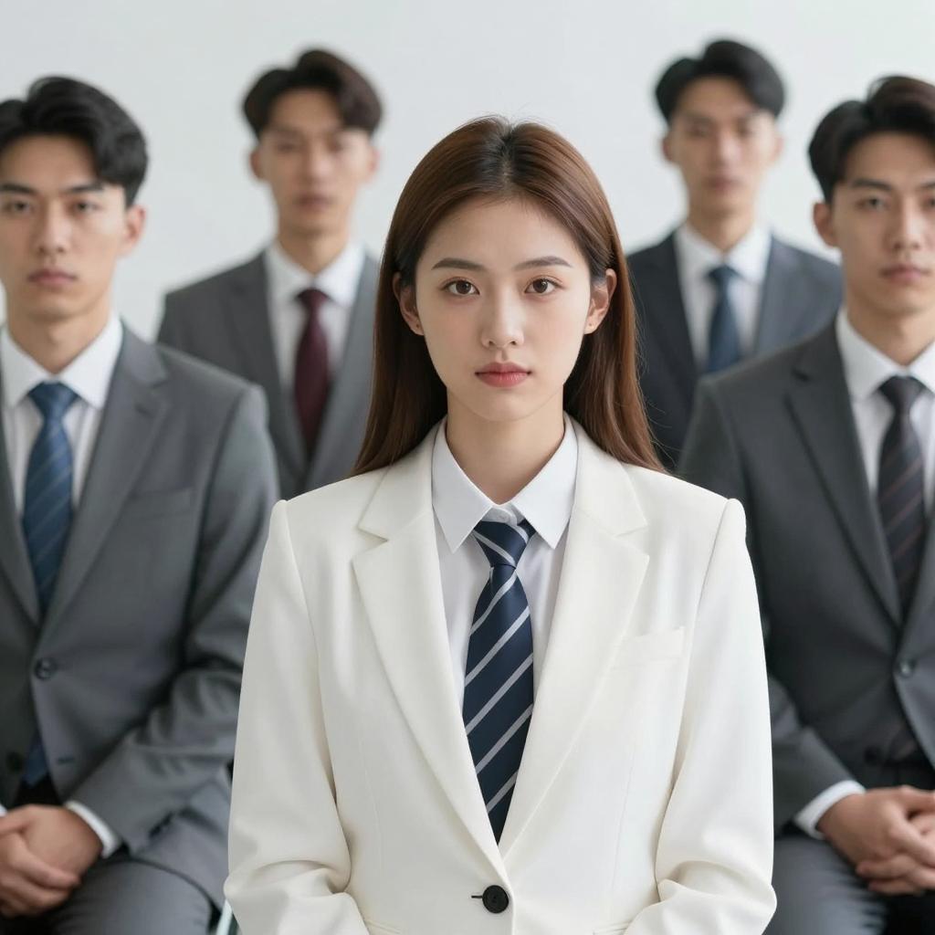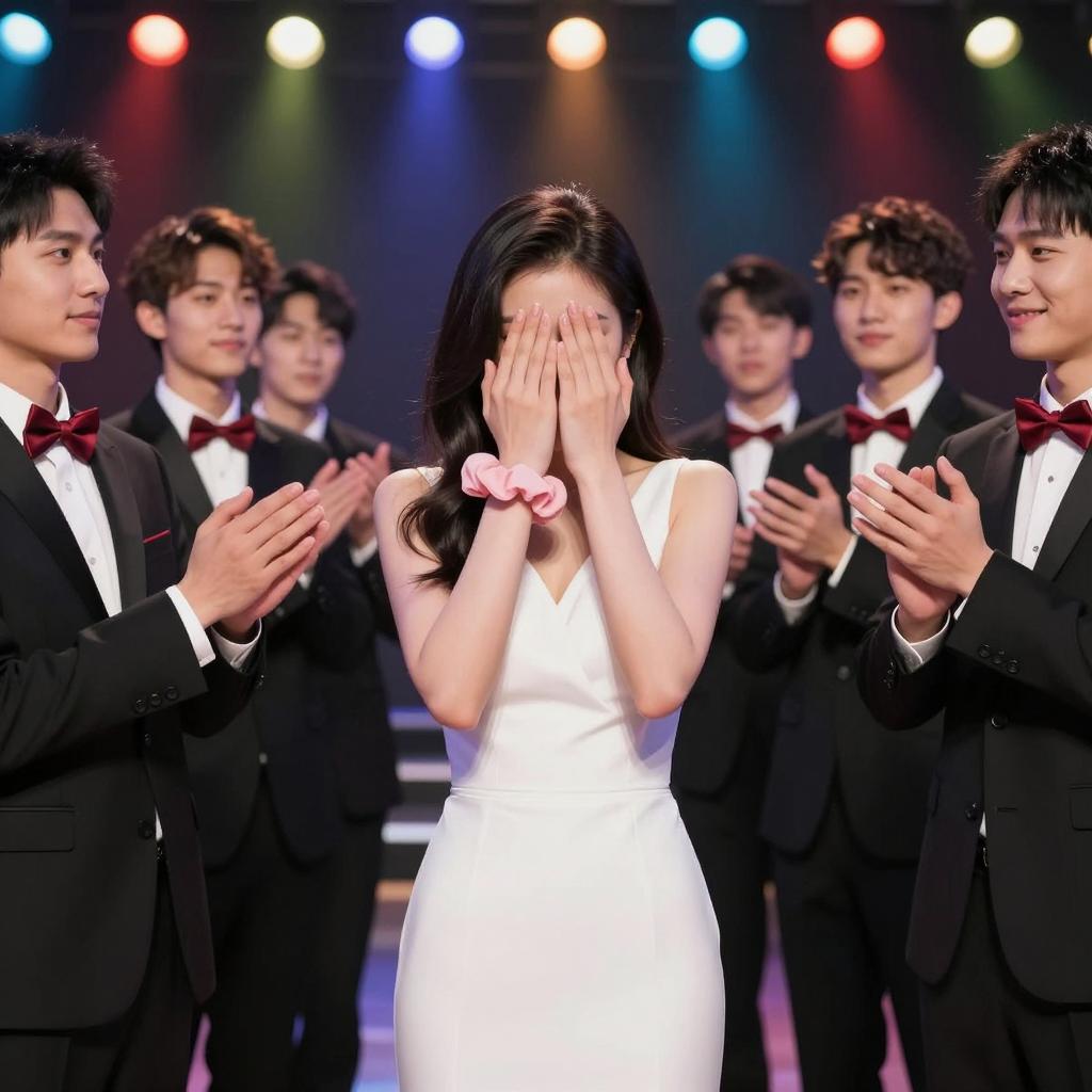 Woman in white dress, pink scrunchie on right wrist, covering face with hands, black hair. Men in black suits, white shirts, red bow ties, clapping around her. Multicolored stage lights in background. 8 men, 1 woman, indoor setting.