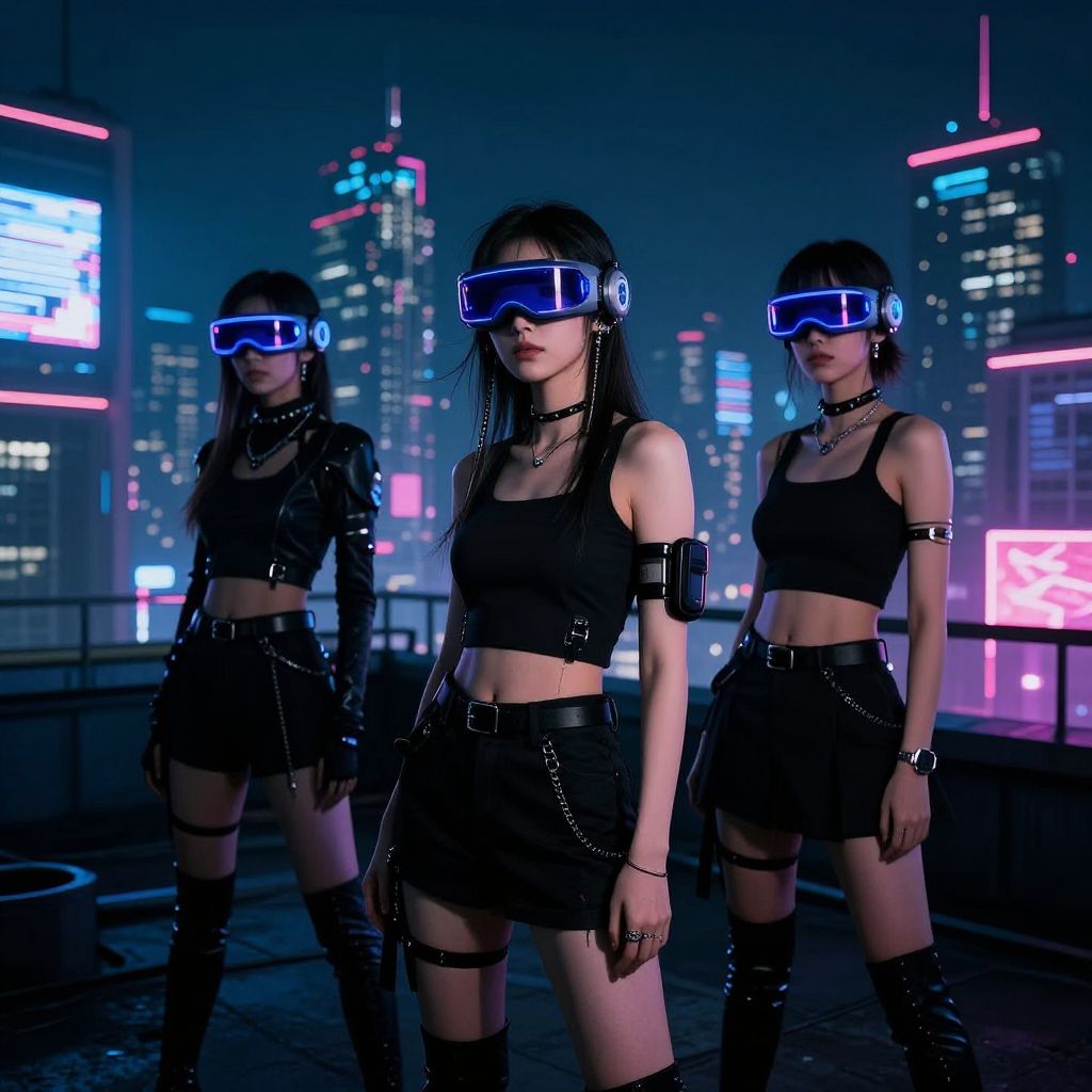 Photograph-style digital image featuring three young women with pale skin, dark straight hair, and slender physiques, standing in a neon-lit urban rooftop setting at night. They wear black crop tops, high-waisted leather shorts with chains, black thigh-high boots, and black armbands. Each woman has a blue virtual reality headset over their eyes, reflecting neon lights. The background showcases a cityscape with skyscrapers adorned with vibrant pink, blue, and purple neon signs. The overall aesthetic is futuristic and cyberpunk, with a focus on dark, glossy textures and bold neon colors. The women stand in a triadic formation, conveying a sense of unity and modernity.