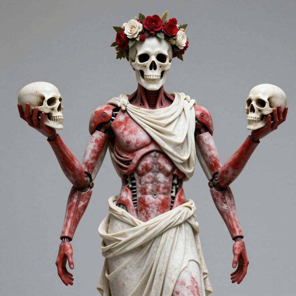 A man in the form of a greek sculpture with a mask in the form of a skull and wreath of flowers skulls in hands dressed in a biomechanical suit, eldritch, red and white color scheme