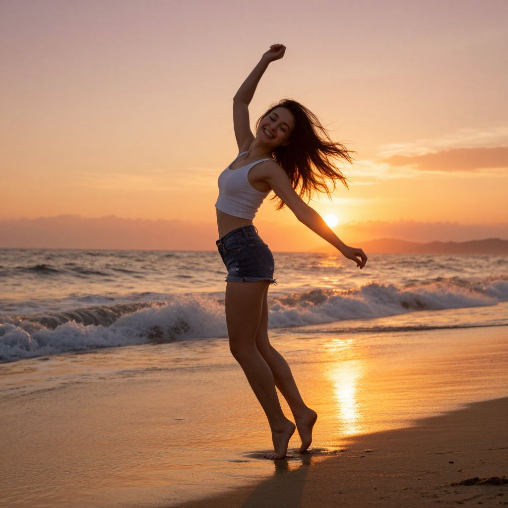 Happy young woman dancing barefoot on a sandy beach at sunset, waves gently crashing, wind flowing through her hair, vibrant warm colors reflecting the golden hour, expression of pure freedom and happiness, cinematic lighting and natural beauty
