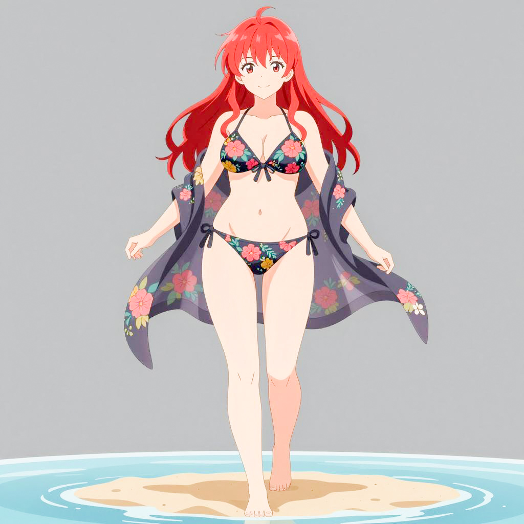 Anime-style figure of a red-haired girl with long hair, wearing a black bikini with a colorful floral pattern, and a sheer, patterned shawl. She stands on a sandy platform in water, with her right leg slightly forward, holding the shawl out. She has a smiling expression. The background is a plain, gray surface. The figure is full-bodied, with large breasts, wide hips, and a slim waist. She is barefoot. The water under the platform is turquoise.