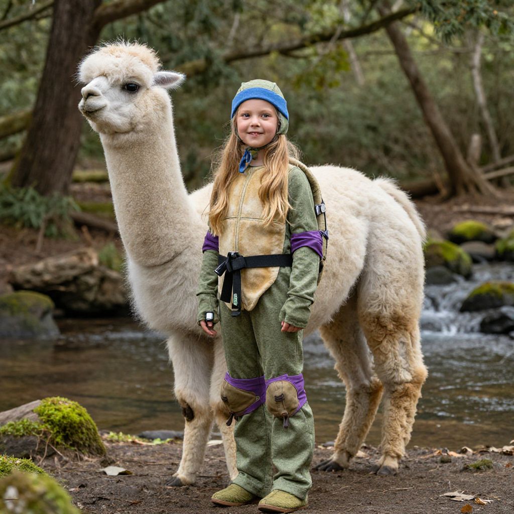Battery Grip 4 year old girl with long blonde hair in a ninja turtle costume adventuring in the woods by a creek with her tall white alpaca,