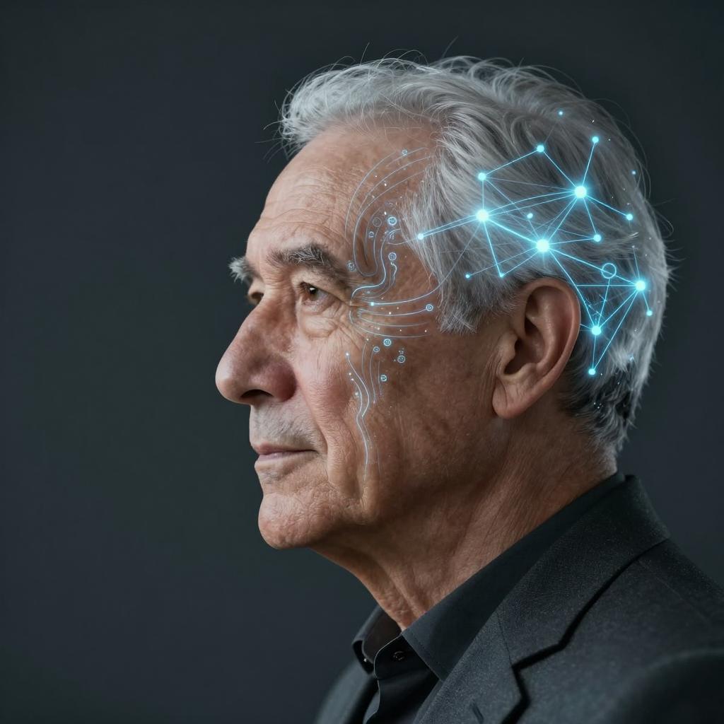 Side profile of an elderly man rendered in a futuristic digital style, featuring illuminated network connections and data flow patterns integrated into his face and hair, symbolizing artificial intelligence and human-computer interaction.