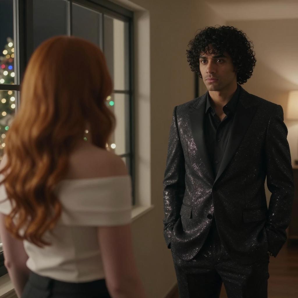 A dimly lit hallway. A man with curly black hair, wearing a dark, sequined suit, stands to the right. A woman with long red hair, seen from behind, wears a white off-shoulder top and faces a window. The window shows blurred holiday lights outside. The man has a neutral expression, and the woman's expression is not visible. The man's hands are in his suit pockets. A lampshade is on the right wall.