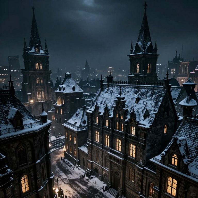 A striking, Gothic dark fantasy cityscape at night, with snow-covered rooftops, illuminated windows, and a dramatic, cinematic atmosphere.