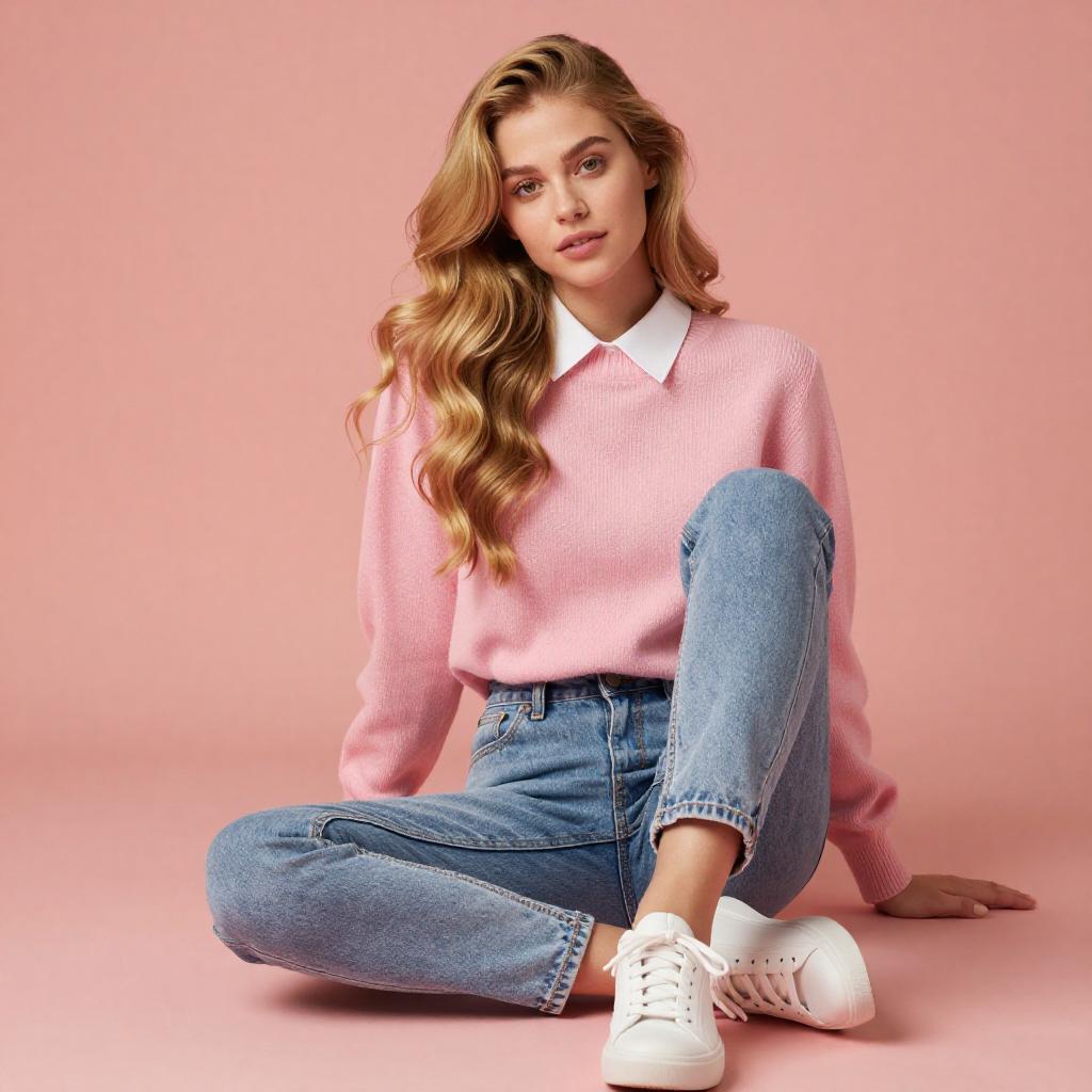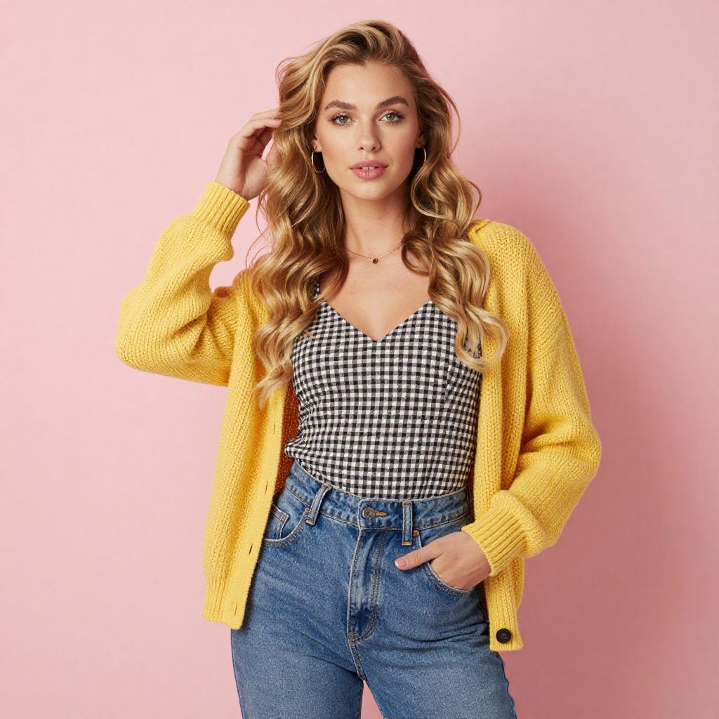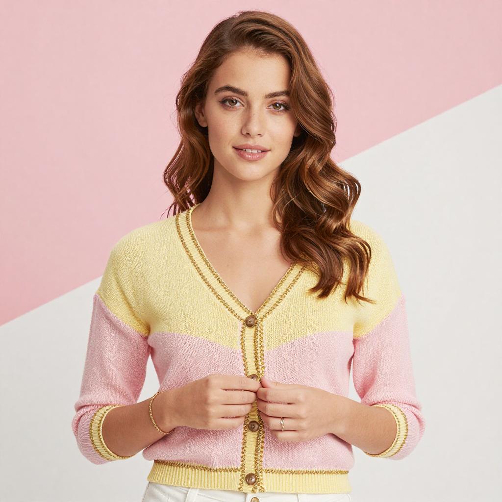 Photograph of a young woman with light skin and wavy, shoulder-length blonde hair. She wears a yellow and pink knitted cardigan with black buttons, standing against a pink wall. She smiles softly, holding the cardigan's edges with both hands, wearing a gold bracelet on her right wrist.