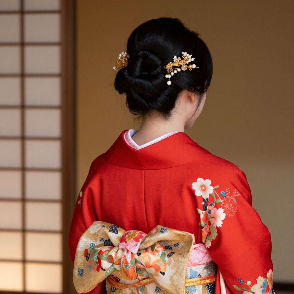 Elegant rear view of a Japanese woman wearing a vibrant red kimono adorned with floral patterns, her hair styled in a neat bun decorated with intricate gold and pearl hair accessories against a softly lit, traditional backdrop.