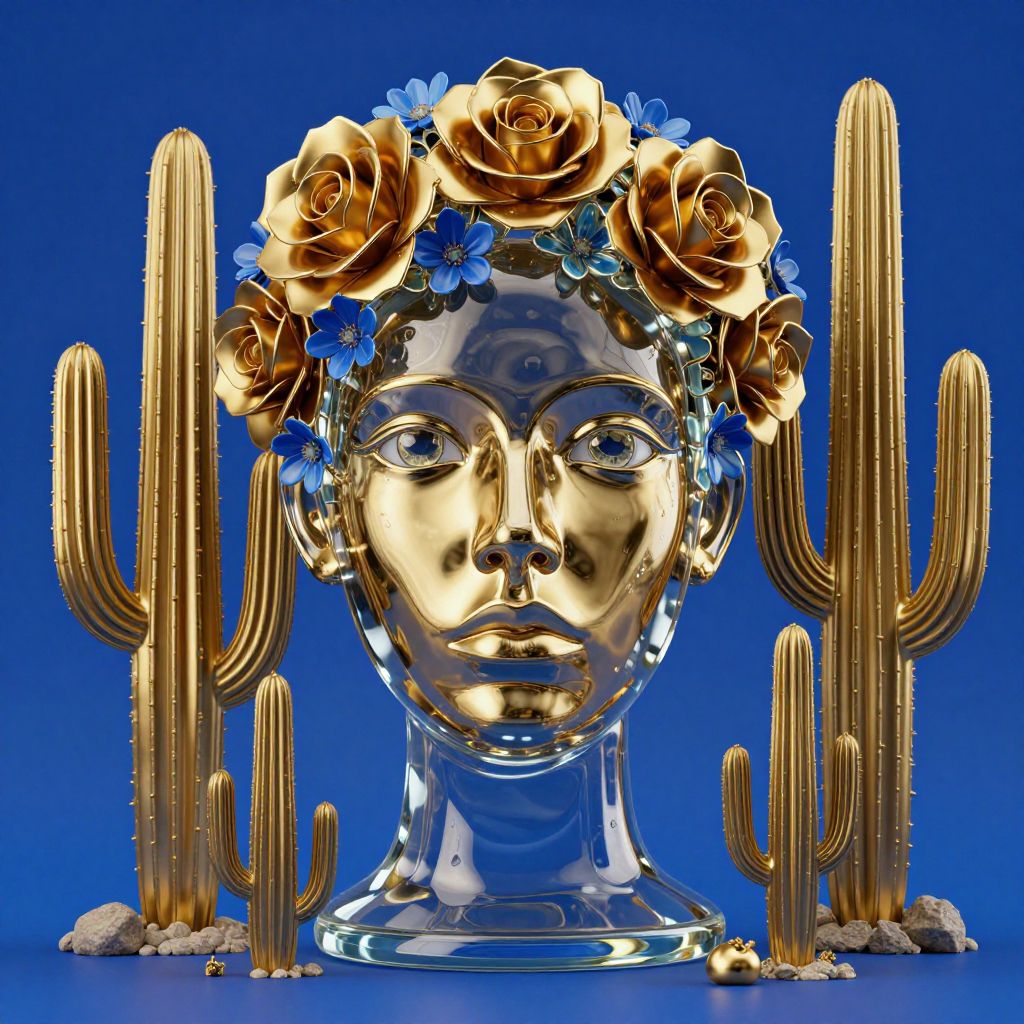 Golden, reflective face with rose and blue flower crown, surrounded by tall, gold cacti, against a vibrant blue background. Photorealistic CGI