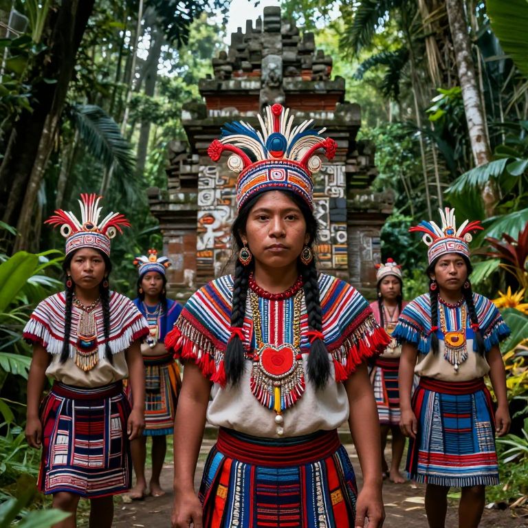 Nahua indigenous people in traditional vibrant clothing, surrounded by lush tropical forest and ancient stone temples, intricate patterns and bright colors, detailed facial features, mystical atmosphere, high resolution digital art