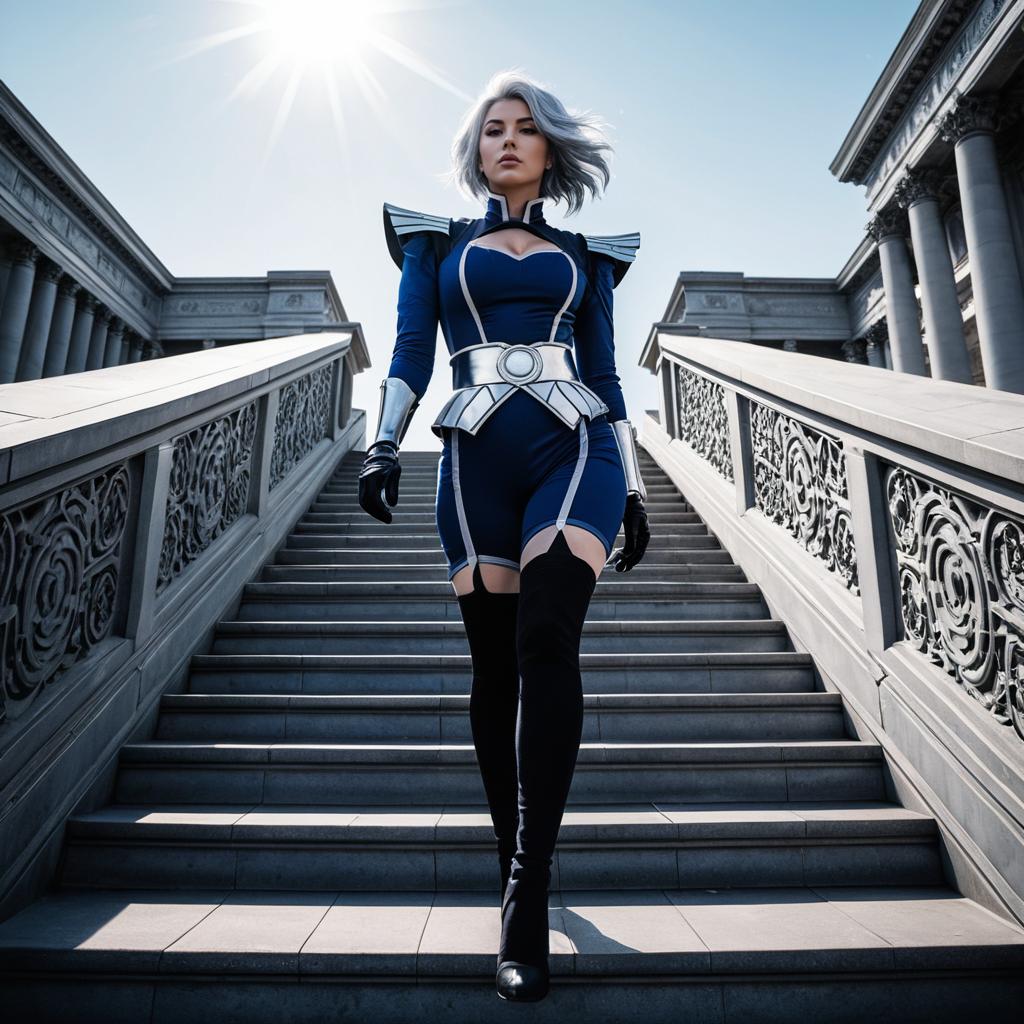Cosplay Woman in Blue and Black Bodysuit on Grand Staircase