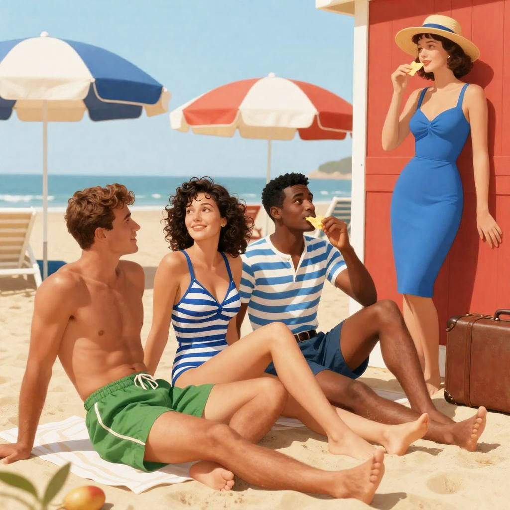 Photograph of four people by a pool. Woman in pink towel stands, three men in blue and tan jackets sit and stand. Pool, lounge chairs, umbrellas in background. Dry hillside in distance. One man reclines on blue chair, others stand and sit. Sunlit, mid-century style. Red sign with "711 Ocean Drive" in bottom right.