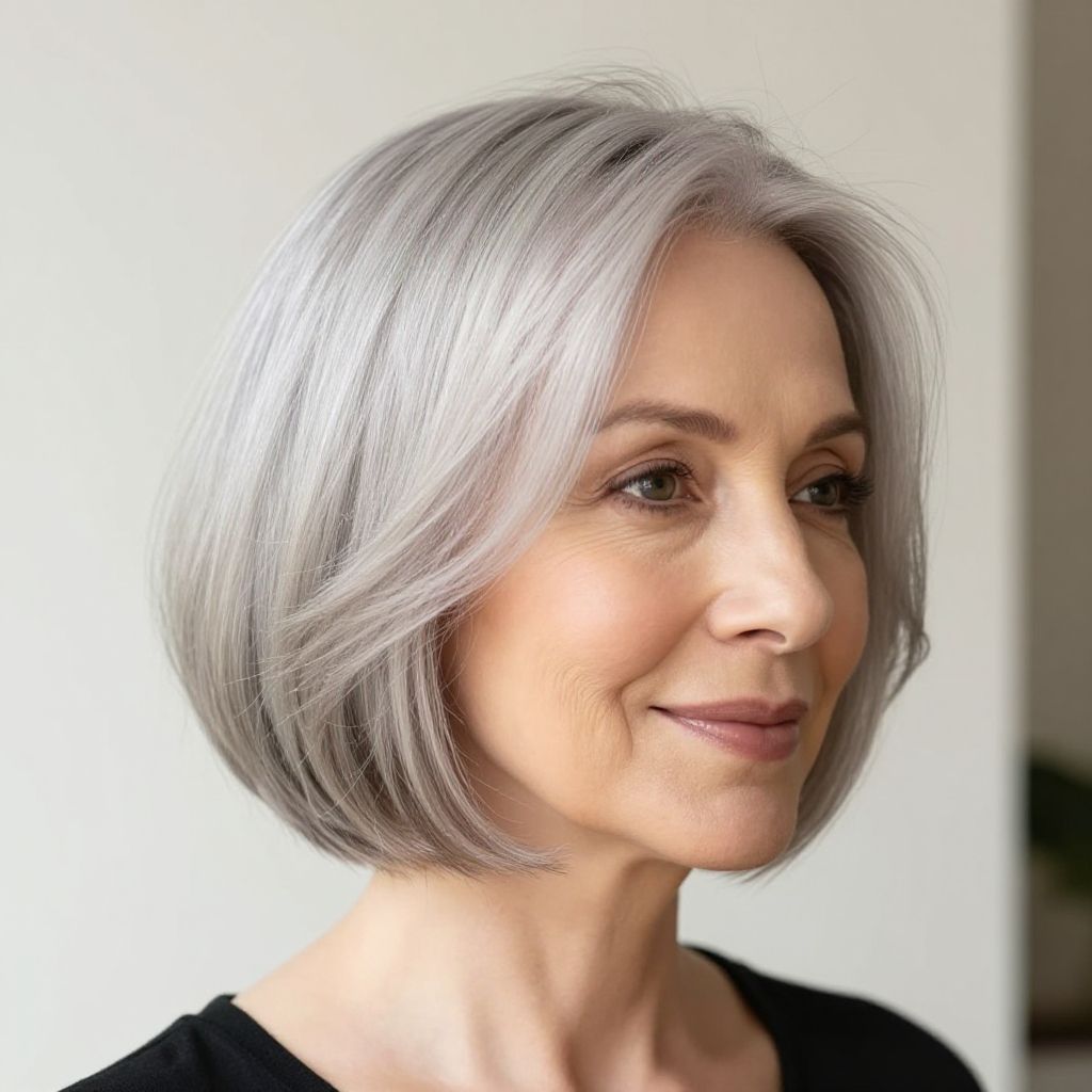 Bob haircut for older women, elegant silver hair styled in a classic bob, soft layers framing the face, natural texture, subtle highlights enhancing volume, gentle smile, warm natural lighting, sophisticated and graceful look, minimalist background.