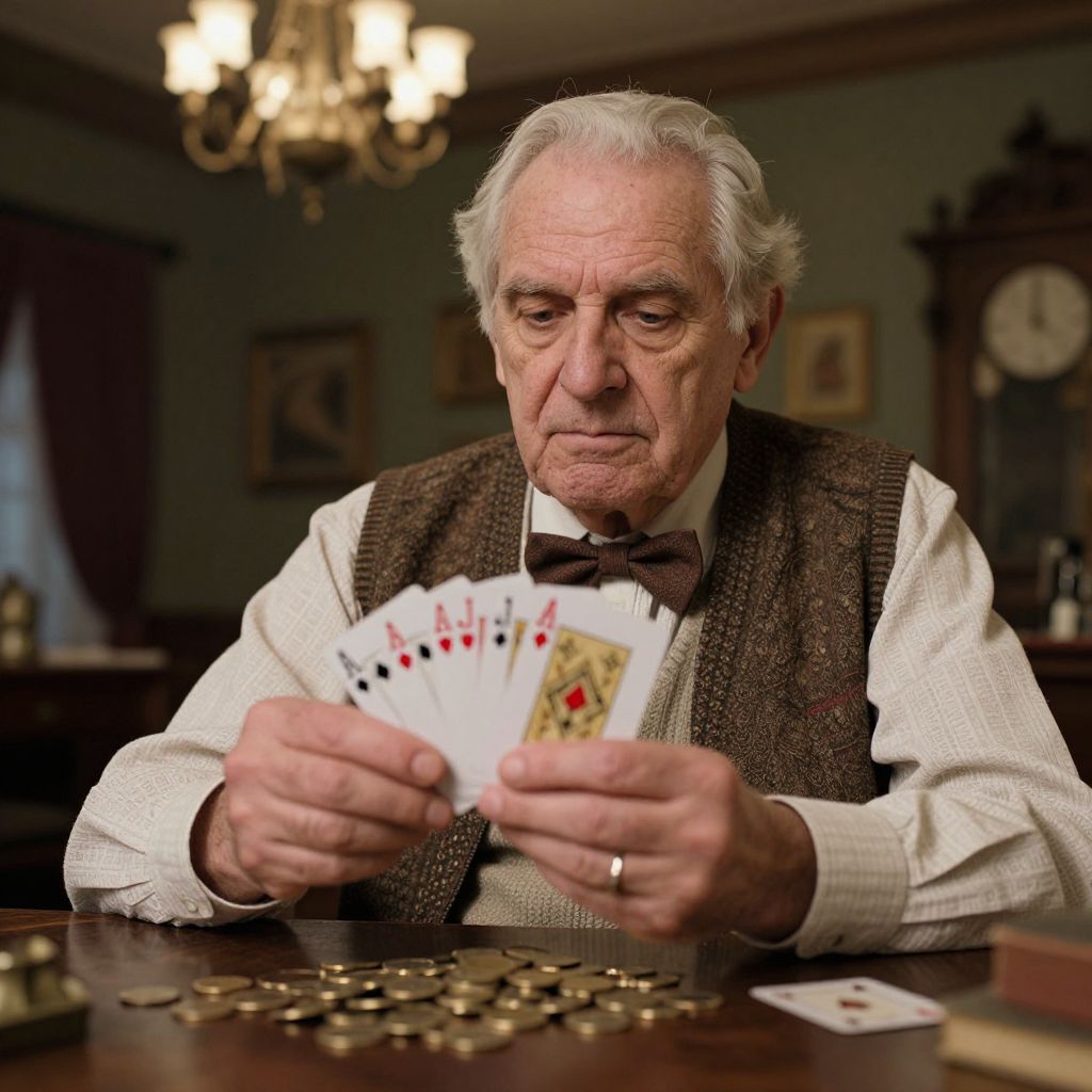 An elderly man in a vintage outfit, holding a deck of cards, surrounded by coins and a chandelier, in a dimly lit, detailed indoor setting.