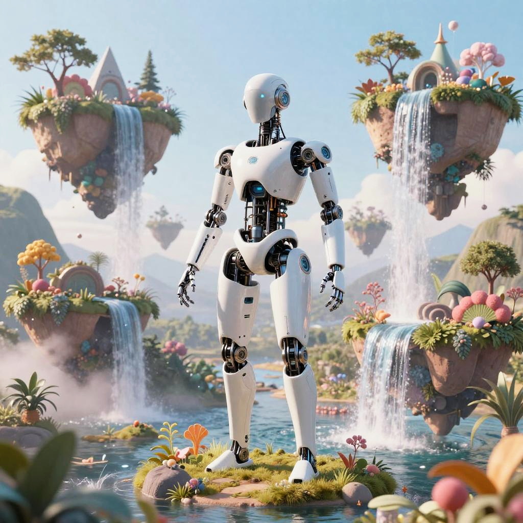 Art prompt ai creating surreal landscapes, a robotic figure crafting dreamlike floating islands with cascading waterfalls, vivid pastel colors, soft lighting, blending technology and nature, imaginative and ethereal atmosphere