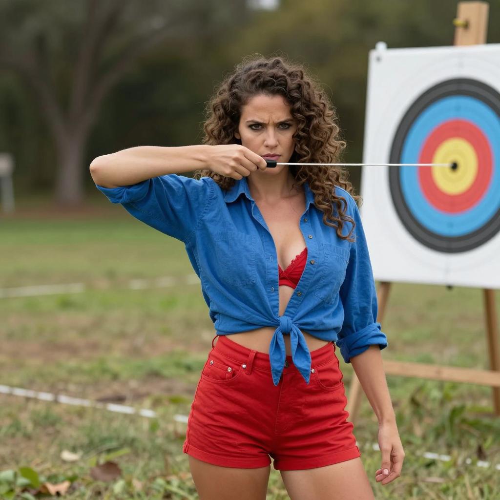 Woman with curly brown hair in blue tied shirt, red shorts, and visible red bra under shirt, stands in grassy area. She holds a string attached to a white, blue, and brown target with a hole in it. Background has trees and foliage. She has an intense, focused expression.