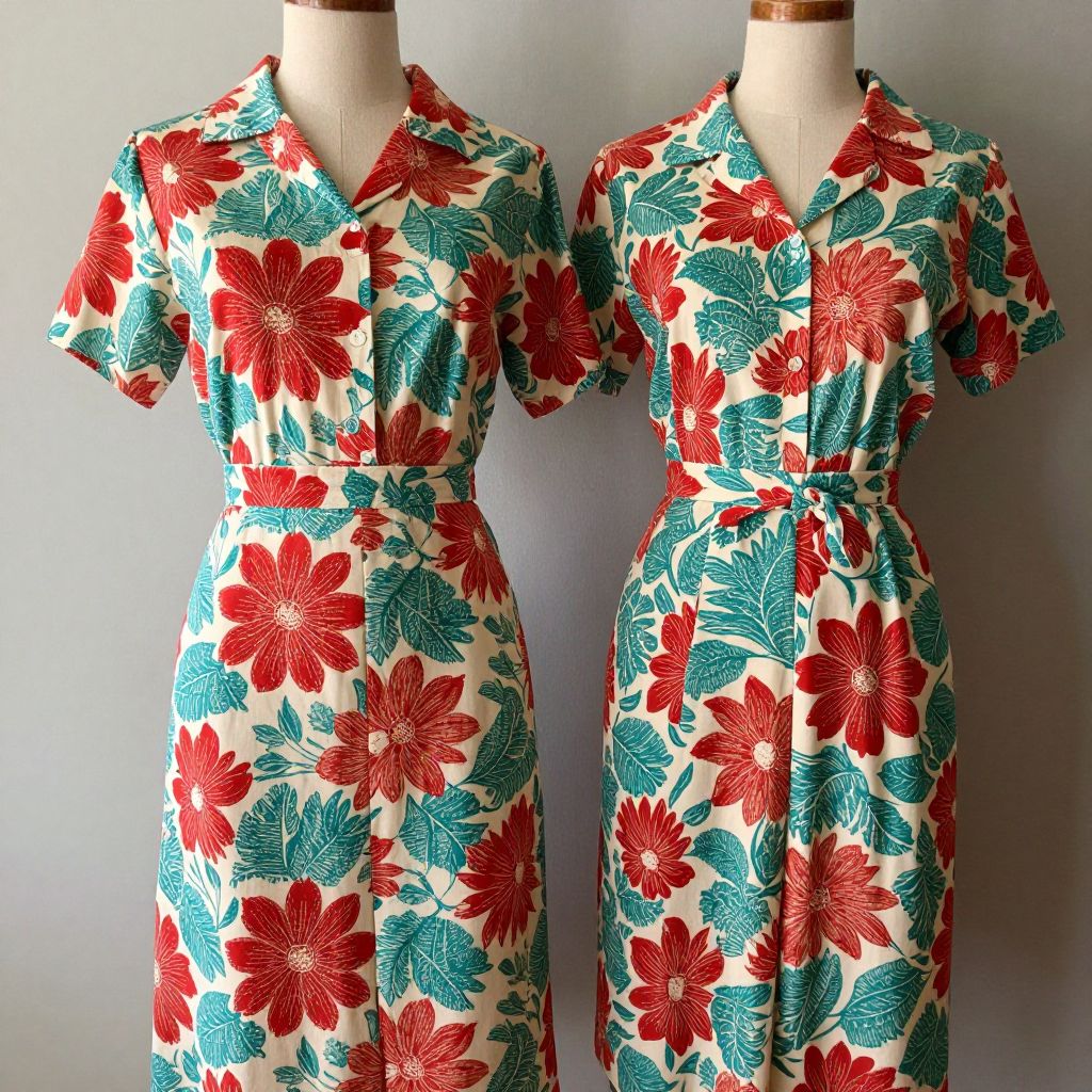 Vintage 1950s Alex Colman cotton batik print two-piece ensemble showcased on mannequins, featuring a vibrant red, teal, and cream floral pattern that exudes rich saturation and timeless charm.