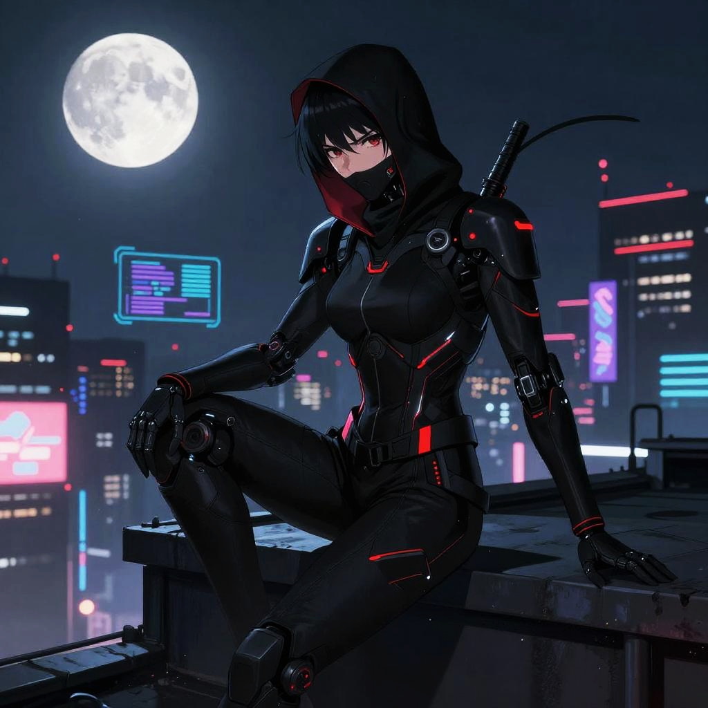Anime cybernetic ninja in sleek black suit with glowing red accents, perched on rooftop under a full moon, futuristic urban background with holographic advertisements, intense and mysterious atmosphere