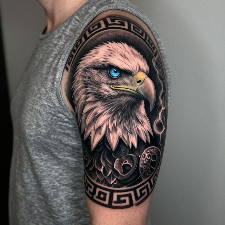 Staff black and grey half sleeve shoulder tattoo of a bald eagle head, mad look, iced blue eyes, smoke, dark themed, natural light, realistic picture, 8k, greek key around the eagle,