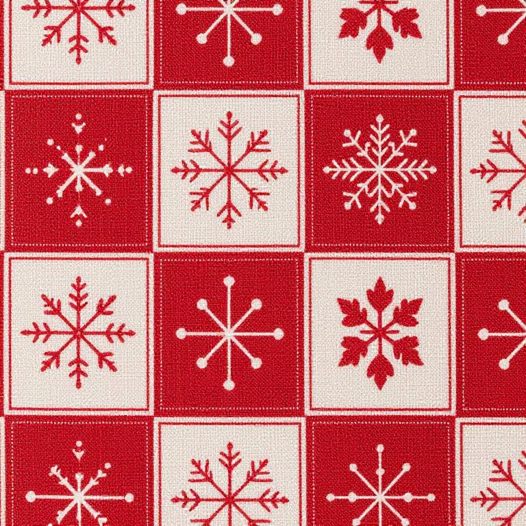 Digital pattern of red and white grid squares, each containing a different stylized white snowflake design, creating a festive, winter-themed look.
