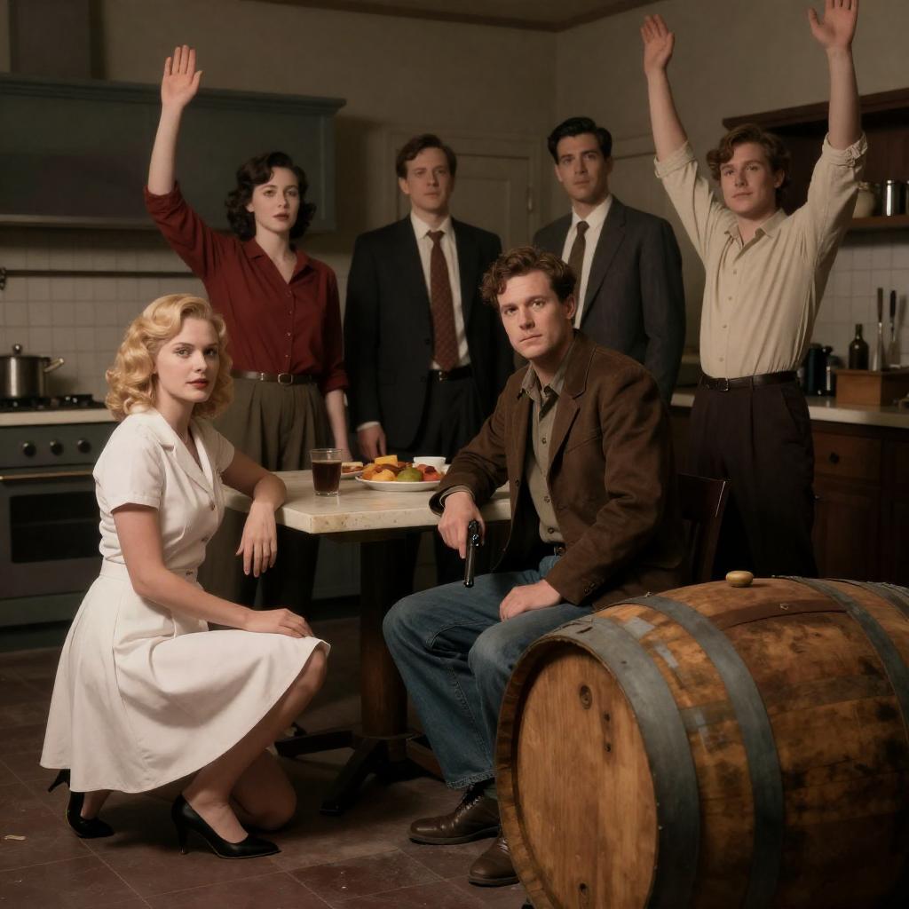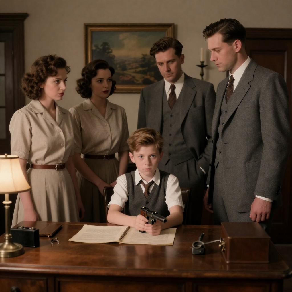 Photograph of a vintage-style family gathering. Seven people, dressed in 1950s attire, sit and stand in a dimly lit room. The central young boy with curly hair leans on a chair, wearing a striped shirt. Background includes a wooden cabinet, potted plant, and lamp. The group's expressions range from neutral to slightly concerned.