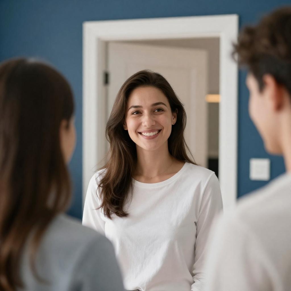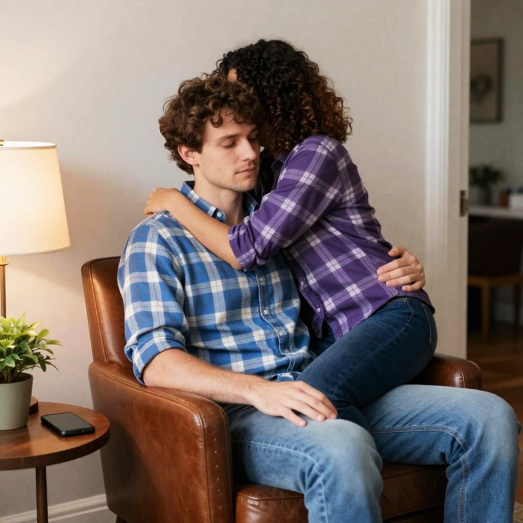 Photograph of a woman with dark, wavy hair and medium skin tone, wearing a white bra, sitting on a pink couch. A person with dark hair, in a gray sweater, holds her hand. She looks down, slightly annoyed. Background includes a wicker chair.