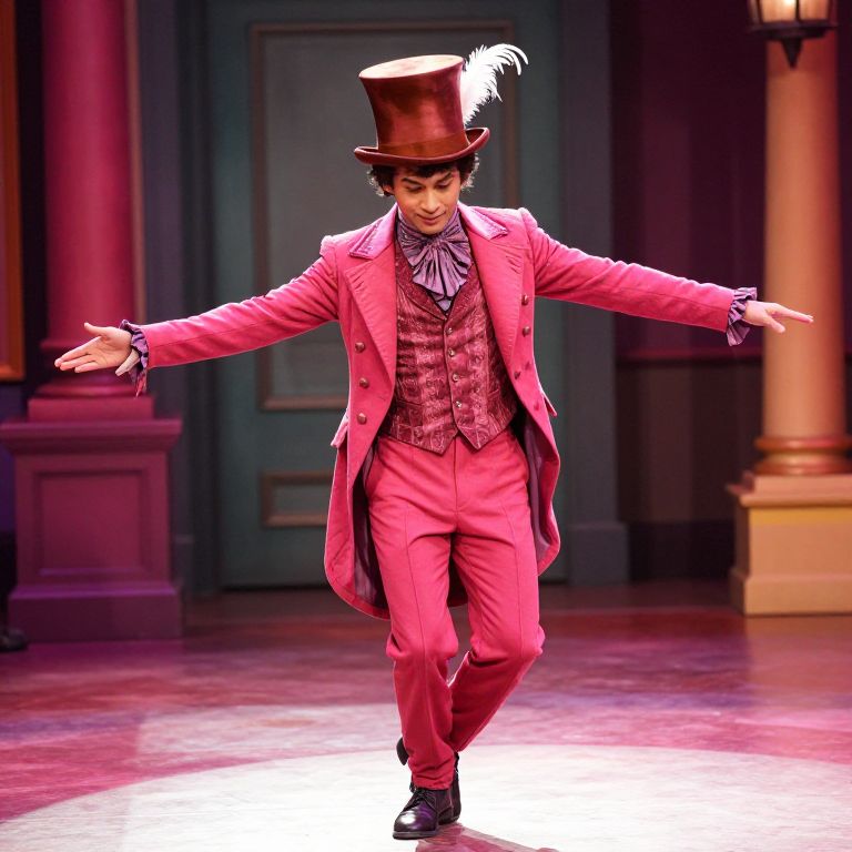 "Willy Wonka Dance, dressed in a pink suit and top hat with a feather"