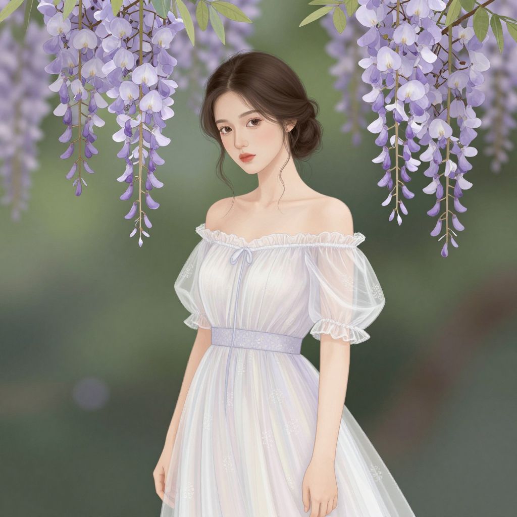 Digital illustration of an East Asian woman with fair skin and dark brown, wavy hair in a loose updo. She wears an off-the-shoulder, white, pleated dress with short, ruffled sleeves. Her expression is calm and gentle, with a slight smile. The background is a soft-focus, green and purple blur, with hanging clusters of lavender wisteria flowers framing her from above. The lighting is soft, highlighting her delicate features and the texture of her dress. The overall style is delicate and romantic, with a focus on soft colors and gentle lines.