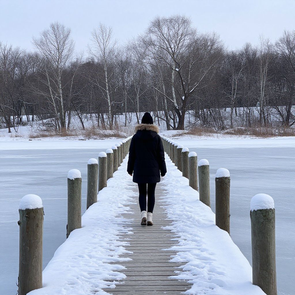 Woman walking away on a snow-covered wooden pier, flanked by rows of snow-topped posts, over a serene frozen lake surrounded by bare trees under a pale winter sky.