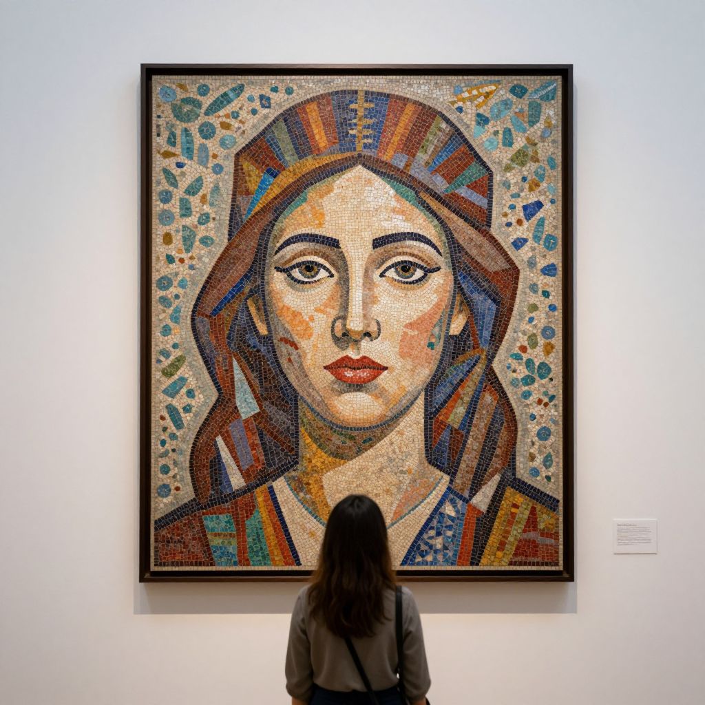 Artfully crafted mosaic portrait of a woman's face, composed of intricate geometric patterns and vibrant colors, hangs prominently on a gallery wall, drawing the attention of a visitor who stands below, observing the detailed craftsmanship.