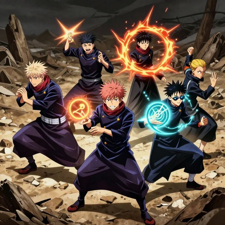 Jujutsu Kaisen concept art illustrating a team of sorcerers preparing for battle in a desolate wasteland, dynamic composition, each character with unique cursed techniques shown through glowing symbols and dramatic energy bursts, sharp anime style with deep shadows.
