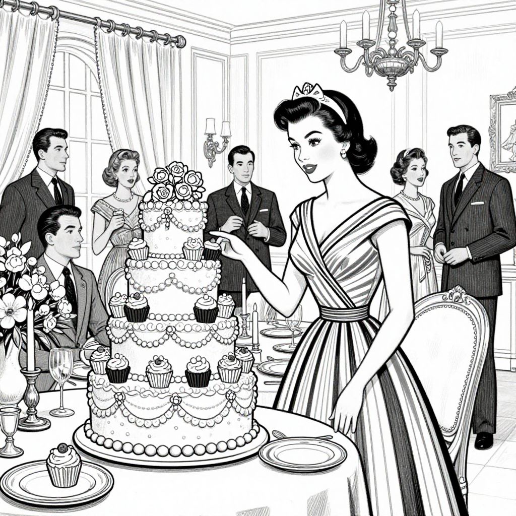The image depicts a 1950s-style fancy dinner party, rendered in a black and white coloring book page style with bold lines and high clarity. The scene is set in a grand dining room with elegant decor, including a large, intricately designed cake adorned with cupcakes and floral decorations, placed on a table adorned with candles and fine china. A woman in a stylish, striped dress with a V-neckline stands prominently in the foreground, her gaze directed towards the cake. In the background, several men in formal attire, including suits and ties, are gathered around the table, engaged in conversation. The room is decorated with lush floral arrangements, hanging curtains, and a chandelier, creating an atmosphere of sophistication and elegance. The overall composition is well-balanced, with the cake serving as the central focal point, drawing the viewer's attention through its detailed and elaborate design.