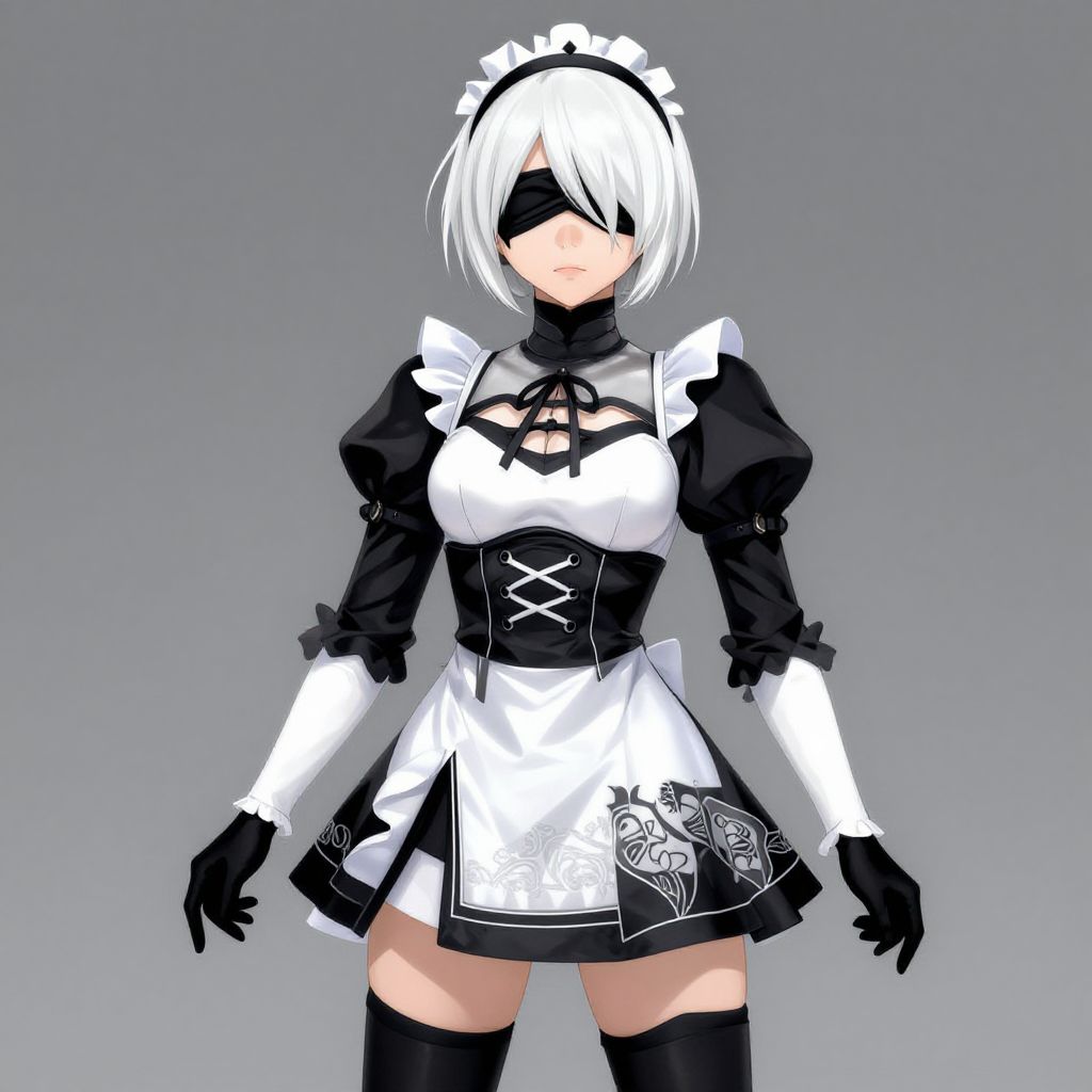 Illustration of an anime-style female character dressed in a revealing white and black maid outfit. The character has short white hair, wears a black blindfold, and black gloves. The outfit includes a frilled headband, a corset with lacing, and thigh-high stockings. The background is simple and gray, emphasizing the character's detailed costume and pose.