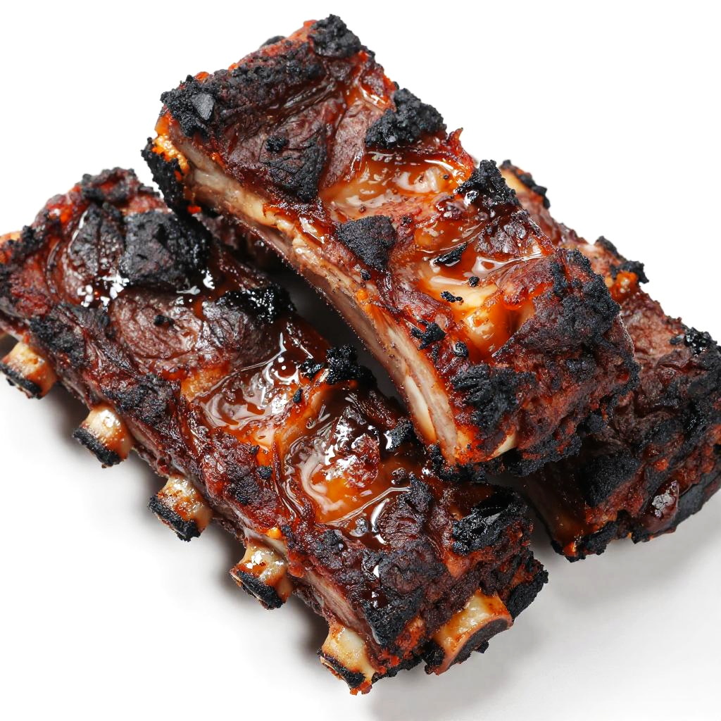 Close-up photo of a pile of dark brown, juicy, and slightly charred BBQ ribs. The meat is tender, with crispy, caramelized edges and visible fat marbling. The ribs are slightly uneven, with some larger chunks and smaller shreds. The background is a clean white, making the rich, dark brown color of the ribs stand out. The texture looks tender and flavorful.