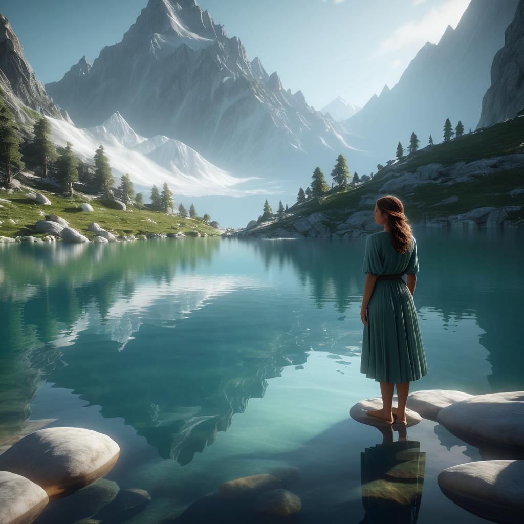 A photorealistic image of a woman in a green dress standing barefoot on stones at the edge of a calm mountain lake. The scene is set in a mountainous landscape with tall, jagged peaks and scattered pine trees, under epic natural lighting that emphasizes a cinematic and peaceful atmosphere.