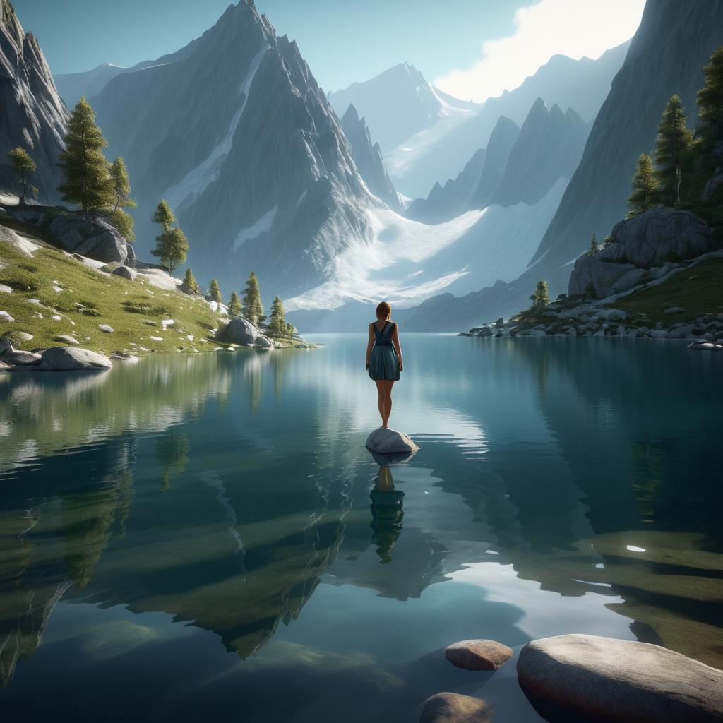 Woman in a tranquil mountain lake, photorealistic, with epic lighting, insanely detailed and cinematic atmosphere.