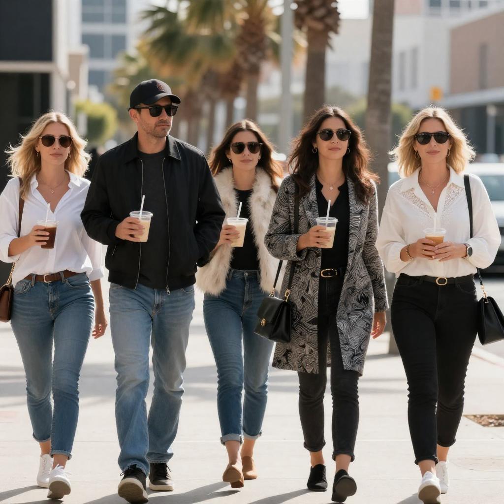 Photograph of five young adults walking down a sunny city street. Four women, one man. Women wearing sunglasses, casual and chic clothes, holding drinks and bags. Man in dark sunglasses, black scarf, gray shirt, black pants, holding drink and bag. Palm trees, storefronts in background. All smiling. Blonde woman in white top, gold pants, black jacket. Brunette man in gray shirt, black pants. Two brunette women in white and black striped clothes. Blonde woman in beige skirt, white top.