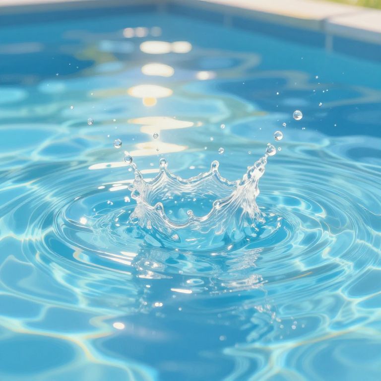 Photograph of a water splash in a vibrant blue swimming pool, capturing the droplets and ripples with bright sunlight reflecting on the water's surface.