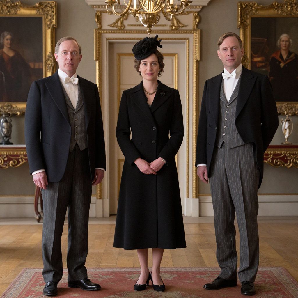 Elegantly dressed characters from *Downton Abbey* stand poised in a grand interior, with two men in formal three-piece suits and bow ties flanking a woman in a sophisticated black coat and hat, all exuding the refined atmosphere of early 20th-century British aristocracy.