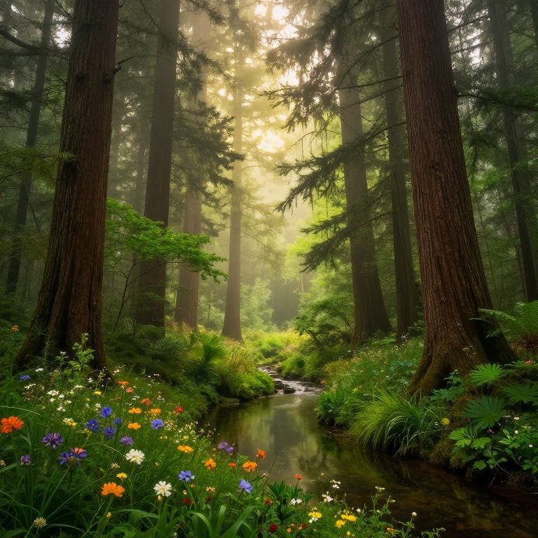 Photograph of a serene forest scene bathed in soft, golden sunlight filtering through tall redwood trees. A clear, narrow stream runs through the center, flanked by vibrant wildflowers in colors of orange, purple, blue, and white. Dense green foliage and ferns surround the stream, creating a lush, peaceful atmosphere. The sunlight creates a misty effect, adding a magical quality to the forest canopy. The texture of the tree trunks is rough, contrasting with the delicate petals and soft greenery. The background fades into a misty, sunlit depth, enhancing the tranquil beauty of the natural setting.
