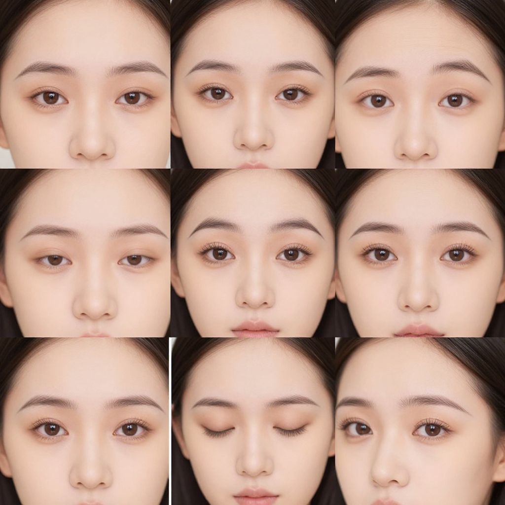 Photograph collage of nine close-up Asian female faces, showing different expressions: neutral, slight smile, closed eyes, and raised eyebrows.