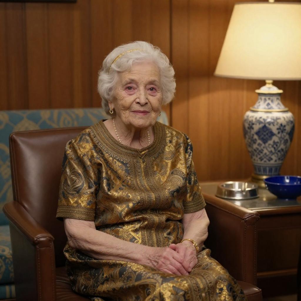 Elderly woman with white hair and gold headband, wearing ornate gold and black patterned dress, sitting on brown leather chair. Wooden wall background, blue-green patterned sofa, table with silver ashtray and blue bowl, lamp with blue and white patterned base. She has a slight smile, looking forward. Lampshade is yellow. Another person's arm visible on left. Warm indoor lighting.
