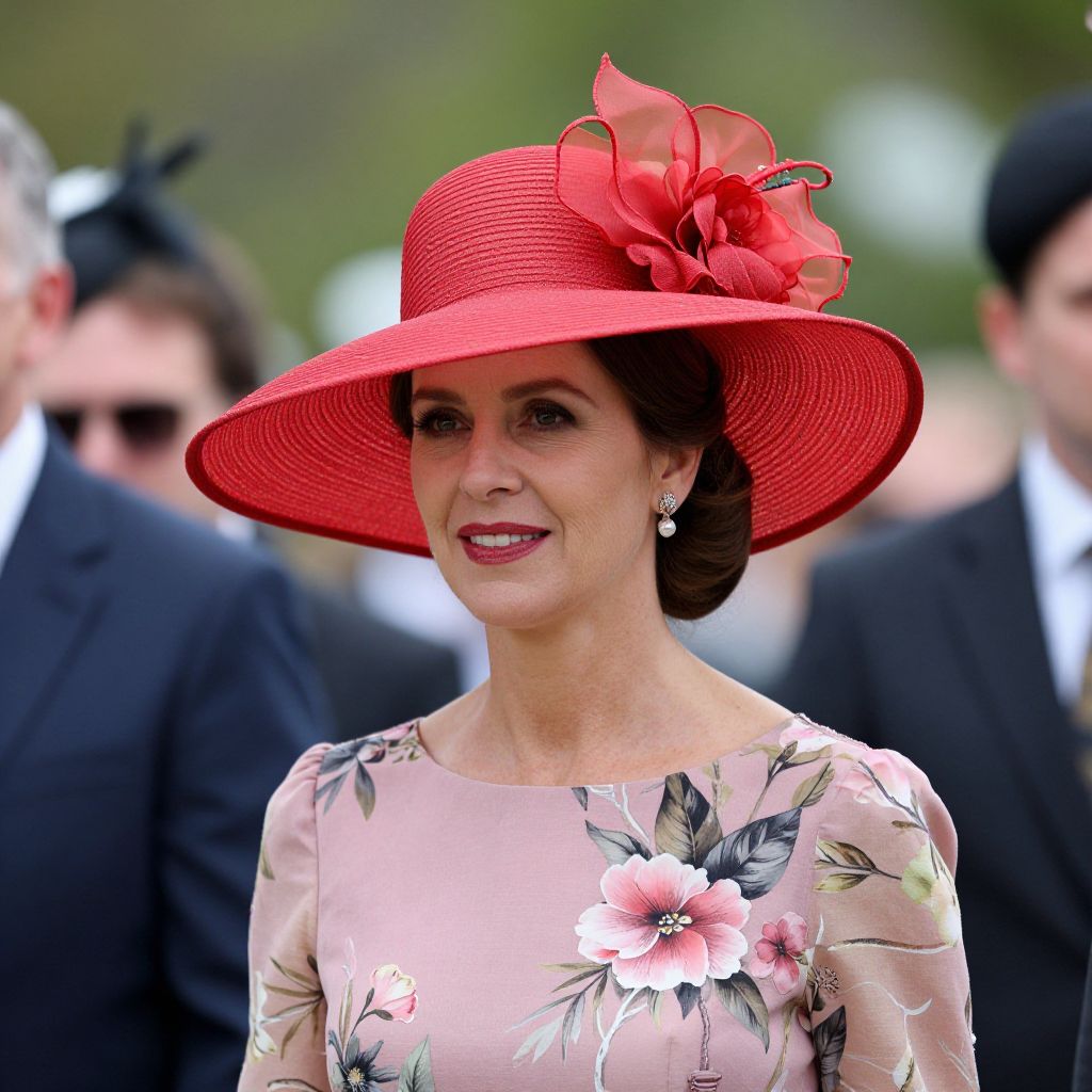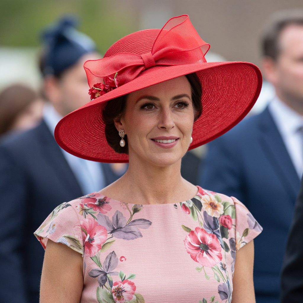 Woman wearing a vibrant red wide-brimmed hat adorned with a bow and floral accents, paired with a pink floral dress, exuding elegance suitable for Kentucky Derby, church events, weddings, or British tea parties.
