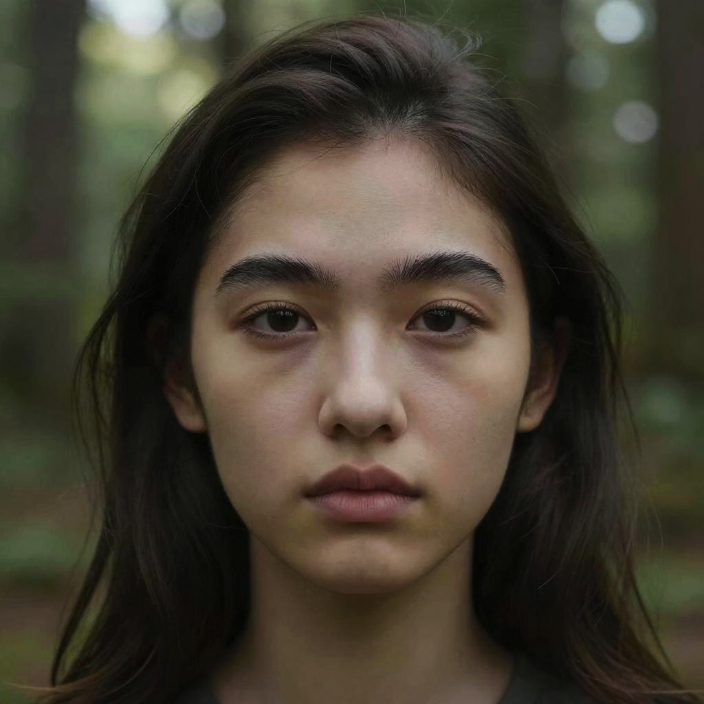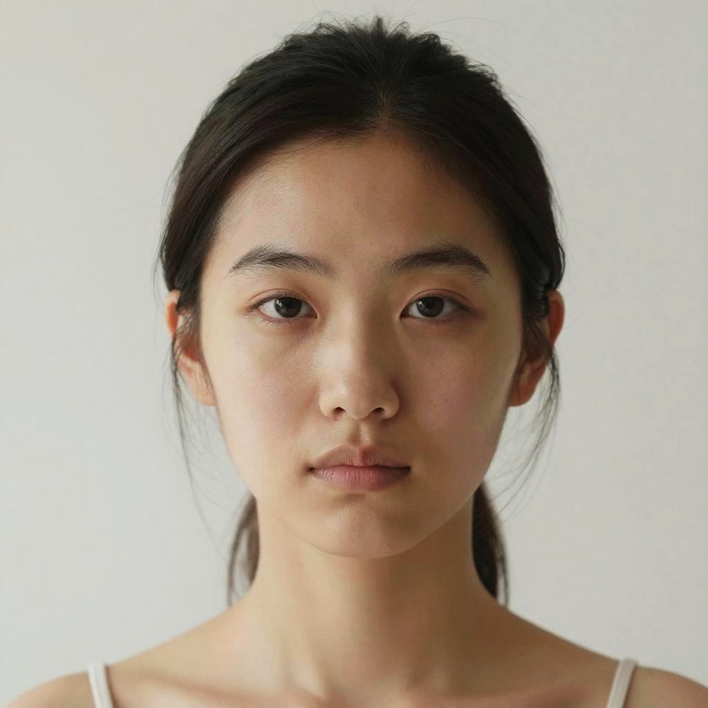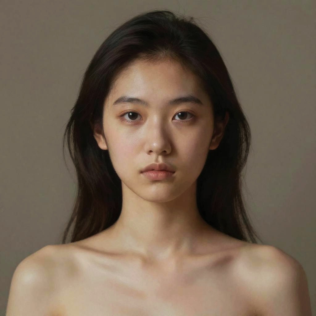 Asian girl without makeup, natural beauty portrait in soft natural light, serene expression, minimalistic background, detailed skin texture, candid and authentic style