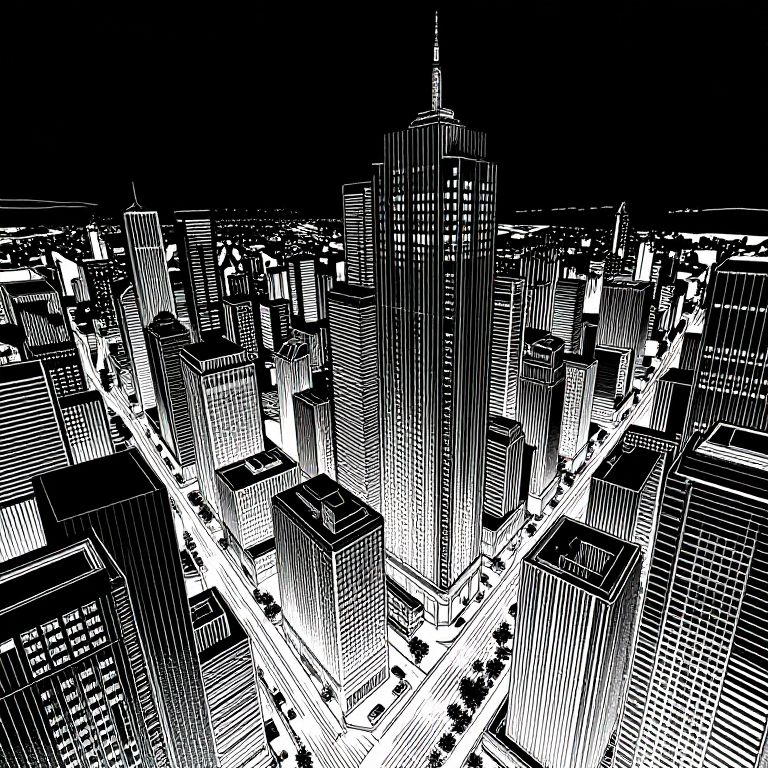 Black-and-white digital drawing of a dense, high-rise cityscape with intricate building lines, featuring a prominent skyscraper with a spire at the center