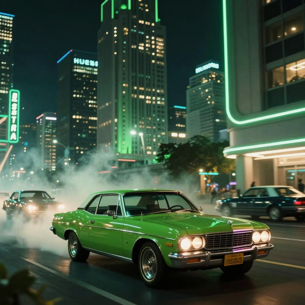 Phonk green aesthetic cityscape at night, neon green lighting, vintage cars cruising, smoky atmosphere, retro-futuristic vibe, dynamic composition, cinematic style
