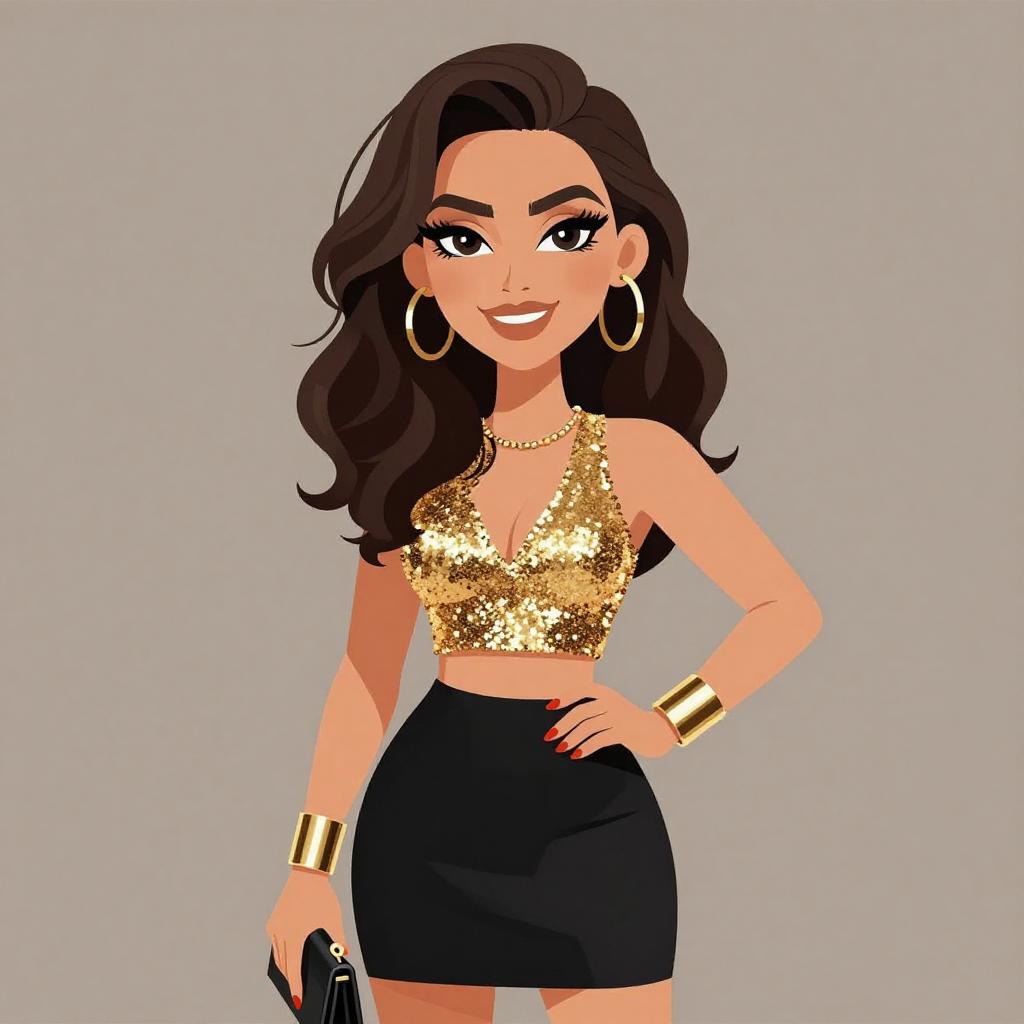 Woman with pretty face and pretty hair. smiling Woman, glam rock, metallic gold sequined crop top, keyhole neckline, sleeveless, black form-fitting mini skirt, large gold cuff bracelet, black clutch. --sref 1467